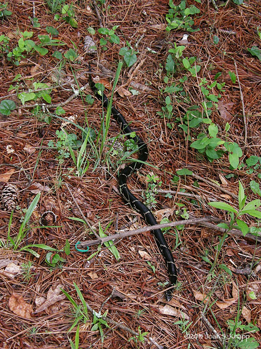 young Eastern Kingsnake (Lampropeltis getula getulaL). It was about 2 feet long and lying in the grass against the woods at the side of the trail. It wasn’t moving when I went over to take a closer look. I don’t know whether it had sensed the vibrations of my footsteps and stopped moving or was simply lying in wait for some hapless prey.